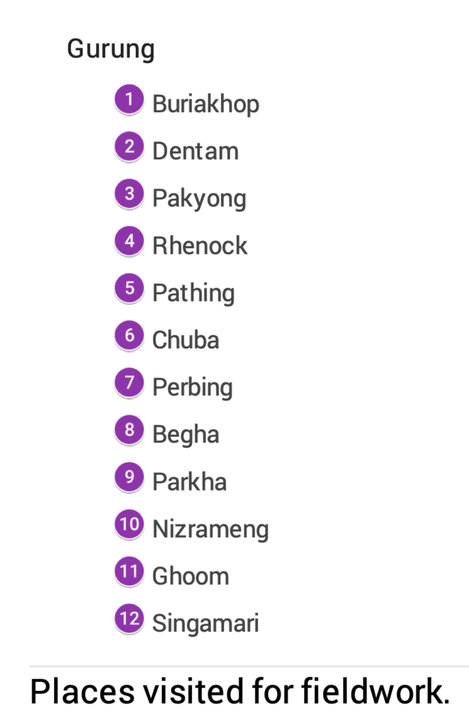 The pilot field survey was conducted by the Centre for Endangered Languages, Sikkim University to ascertain the sociolinguistic and language endangerment situation of the language in Pathing, Upper Yangyang, Nizraming, Tingle, Bethghari and Chuba in South Sikkim; Bariakhop, Dentam and Begha in West Sikkim; and Parkha in East Sikkim. The pilot survey on the language was conducted from 3rd-20th July 2017 in 10 villages spread across the three districts of Sikkim. Another round of field survey was carried out on 14th-15th February, 2018 in Ghoom Bhanjyang in Darjeeling. The following members conducted the survey: