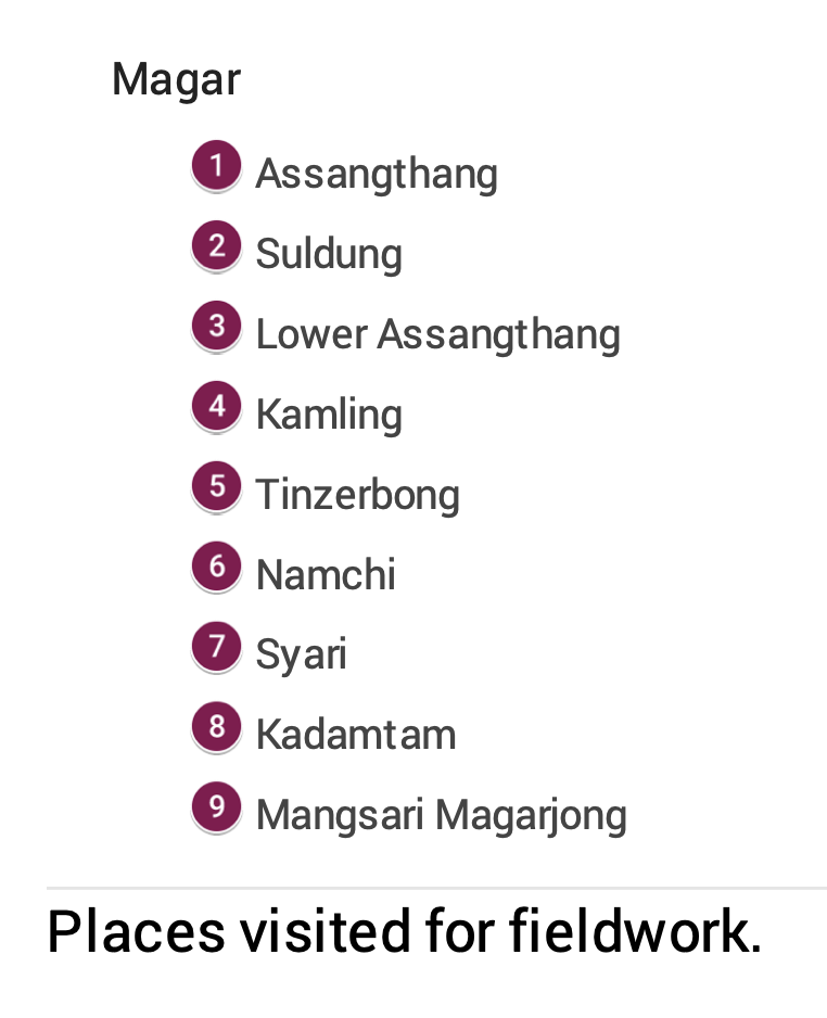 The pilot fieldwork on Magar was conducted by the Centre for Endangered Languages, Sikkim University at Suldung, Kamling and Tinzerbong in West district; Lingding and Kadamtam in East district; and Assangthang and Raikagaon in South district: The team members were: